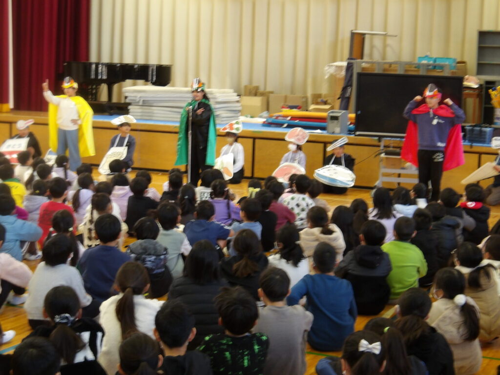 給食委員会がクイズを交えた劇を披露してくれました。赤黄緑バランスよく食べないと、健康にはならないみたいですね。劇でも三色でパンチをしたからこそ菌をやっつけることができていました。給食は、栄養のバランスを一番に考えています。苦手なものがあっても、無理をしない程度に頑張って食べましょう。