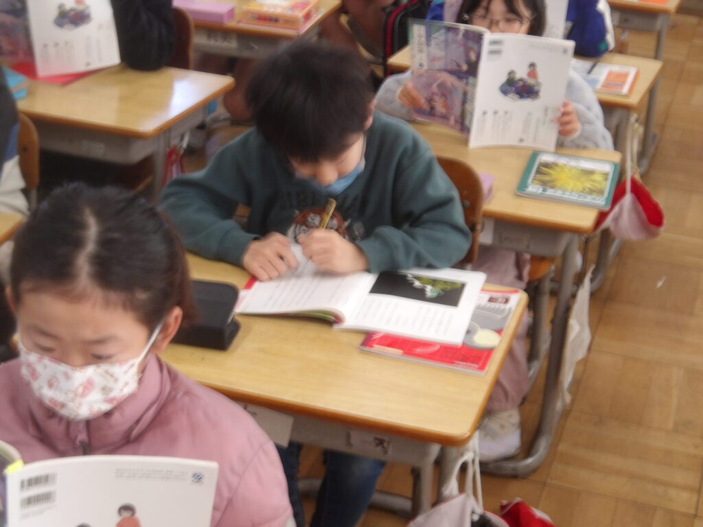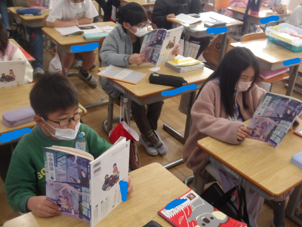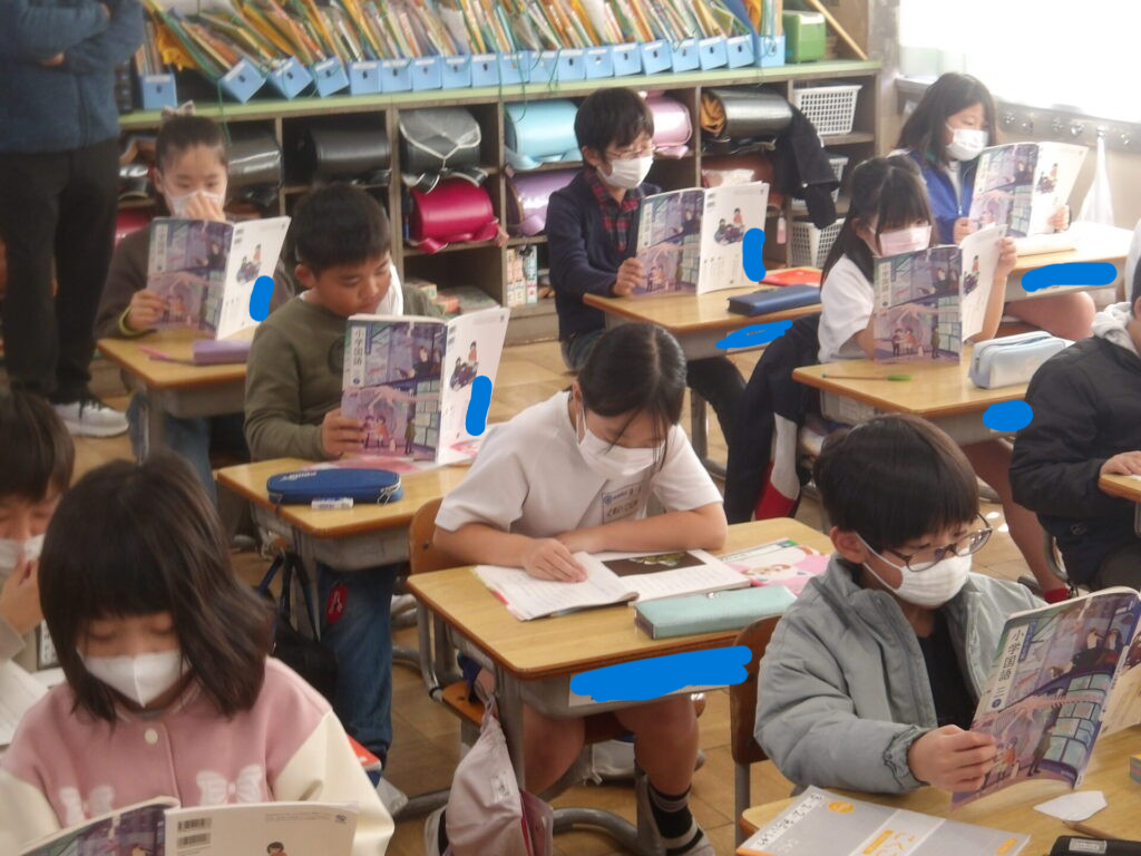 自分が小学生のころ、朗読(音読)の時は教科書を持って聞かなければならないと言われていました。自分は眼だけで追うとどうしても内容が入ってこなくてすごく苦労した思い出があります。今年は子供達にはいくつか選択肢を与えています。今まで通り教科書を持って聞く、指で追いながら聞く、鉛筆で線を引きながら(どういったときに線を引くのかは伝えてあります。)聞く、電子黒板の文字の移動を見ながら聞くです。❝楽をするために❞教科書を置く人はいませんでした。一人一人自分に合った読み方を選んで取り組む姿はどこか成長と自立を感じます。これからも自分に合った勉強の仕方を自分から探していってほしいです。