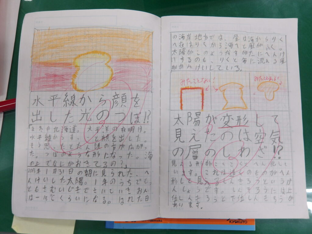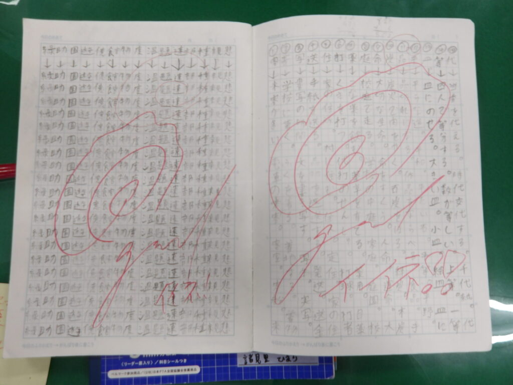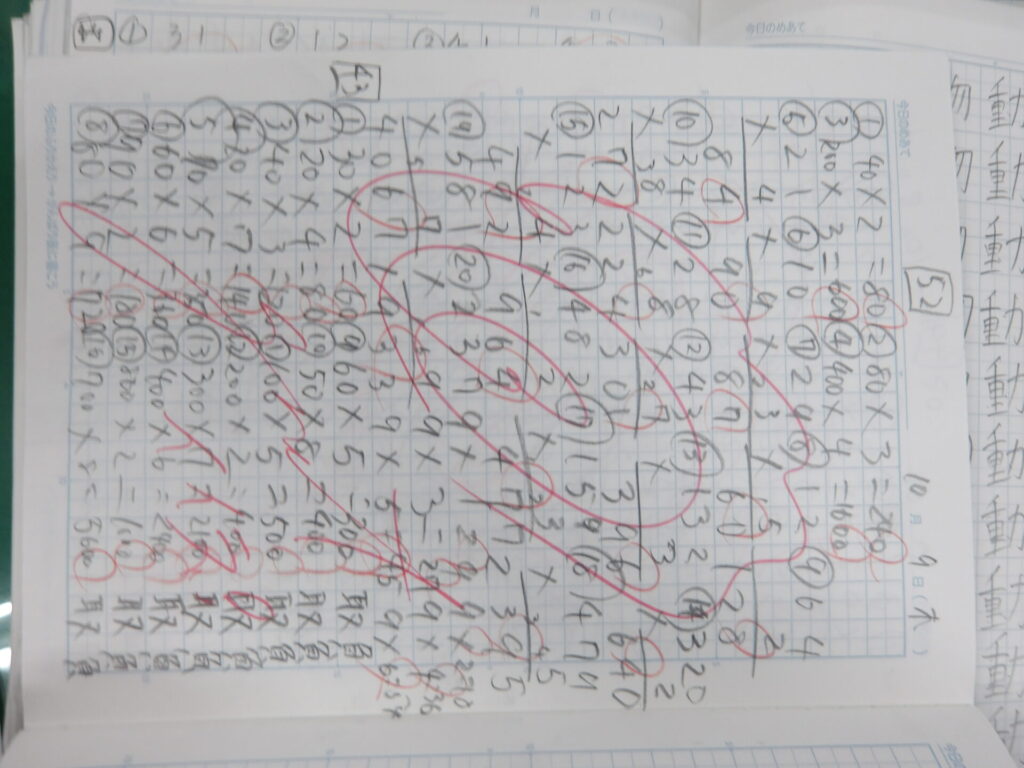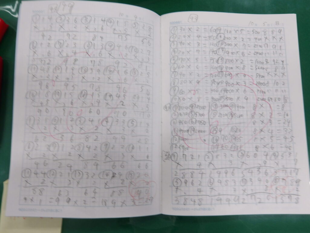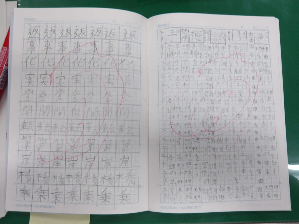 3年生になり、宿題に自主学習が追加されましたね。難しいのは、「何をどこまでやればいいのか」だと思うのですが、いかがでしょうか。今回は各クラスの自主学習を見ていこうと思います。今回は2組。2組でも、漢字、計算、意味調べ、理科社会の調べ学習、さらには外国語、日常で気になったことを例として挙げているようですね。2組の自主学習はどれだけ見やすいノートにするかではなく、与えられたページ数をしっかり埋めることに重きを置いているようですね。よく見ると、計算をやっていて、空いたマスに漢字を書いている子もいますね。素晴らしい。全員同じ範囲を同じスピードで進めていく学級生活の学習の中で、差が出るとしたらおそらく自主学習(予習、復習)の量でしょう。早い子はもう5冊目に突入しています。後で楽をするために、今頑張っておきましょう!
