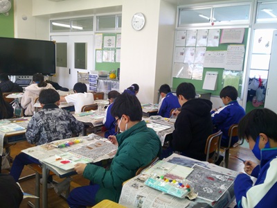 5年生 図工 2026年1月19日 最終更新日時 : 2026年1月19日 kumagaya_contribute 図工で『たいせつなもの』を木版画で表しています。黒インクですった後に、裏から絵の具で色つけをしました。 Digital Camera