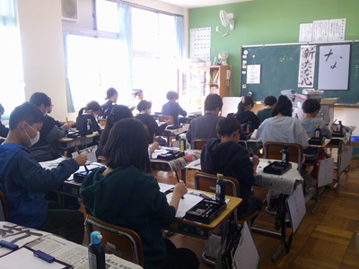 5年生 書きぞめ 2025年11月28日 最終更新日時 : 2025年11月28日 kumagaya_contribute 書きぞめ練習をがんばっています。今年度は『新たな心』です。まずは、半紙に大きく書けるように練習しています。 Digital Camera