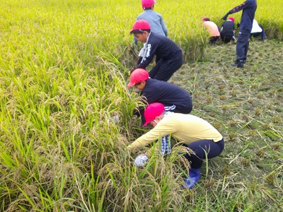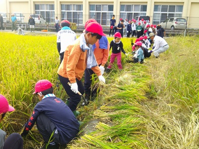 今日は地域の方々に教えていただいたり保護者の皆様に手伝っていただいたりしながら稲刈りをしました。稲を刈り取ったり運んだり・・・。事前に草刈りをすませていただいていたとはいえ、自分から進んで働き2時間目のうちに田んぼの稲をを刈り取ることができました。休憩のちに、大きな草木が生えている方の田んぼの稲刈りもがんばりました。米作りの大変さを改めて実感し、給食のごはんをいつも以上においしくいただけました。ご協力ありがとうございました。