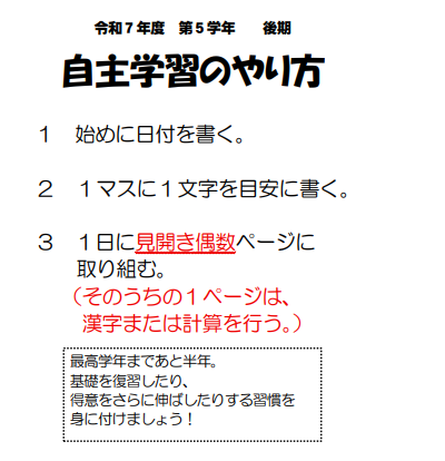 最高学年に向けて、自主学習の取り組みを以下のようにレベルアップしました。赤字部分が変更点です。今日、オリエンテーションしてから自主学習ノートにのりづけしました。あと半年、基礎を復習したり得意をさらに伸ばしたりする家庭学習の習慣をしっかりと身に付けて最高学年に進級してほしいです。