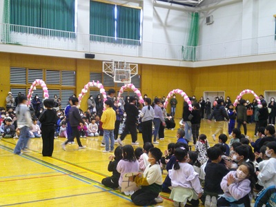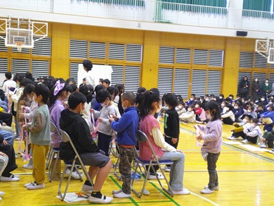 大規模改修工事も今年度はひと段落し、体育館全面を使っての「6年生を送る会」ができました。代表委員が中心となって12月から準備してきました。今年度はステージ側前半分しか使えない中での練習、前向き縦列の隊形ということで入退場の移動、小道具や楽器の位置などがイメージしにくかったと思いますがどの学年も工夫をこらした出し物を披露しました。そして6年生からのお礼の出し物ももりだくさんで見ごたえたっぷり。1・2年生からのペンダント、3年生からのかざり、4年生からのアーチ、5年生からの題字や準備等それぞれの学年からのお祝いと感謝の気持ちを6年生へ伝えました。いよいよ6年生の卒業です。
